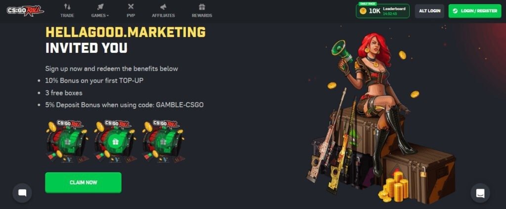 CSGORoll Suomi on rakennettu niin, että alkuun pääseminen on mahdollisimman helppoa. Kirjaudut sisään omalla Steam-tililläsi, ja pääset suoraan kaikkiin toimintoihin ilman erillisiä rekisteröintivaiheita. Tämä nopea aloitus tekee alustasta vaivattoman ja erityisen houkuttelevan suomalaisille käyttäjille, jotka arvostavat suoraviivaista käyttökokemusta.